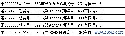 与前期历史同时奖号对比分析,在最近五年开奖中,第283期同时奖号与第296期同时奖号齐出现了调换号码: