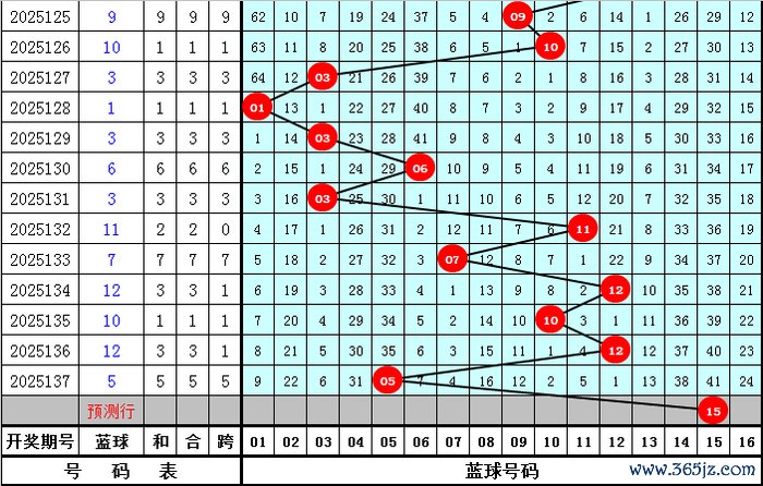 在历史同时第138期开奖中:蓝球号码012路比为3:7:9,本期详确0路蓝球出现,宥恕蓝球号码15。