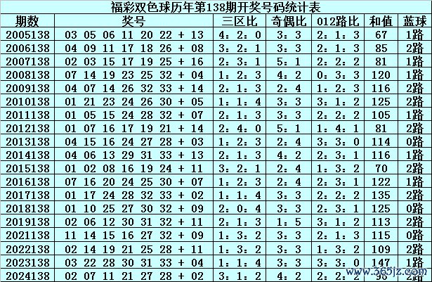 在第138期历史同时奖号中,红球三区散布总比例为35:33:46,奇偶总比例为58:56,012路比为36:43:35,和值散布在67-147之间,蓝球号码012路总比例为3:7:9。