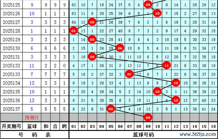 蓝球分析:上期蓝球号码05遗漏为35期,最近10期冷码蓝球解冻4个,温号蓝球回补3个,热号蓝球出现3,现在蓝球冷号有6个:02 04 08 14 15 16,温号蓝球有5个:01 03 06 09 13,热号蓝球有5个:05 07 10 11 12,本期看好温码蓝球回补,饶恕蓝球号码09。